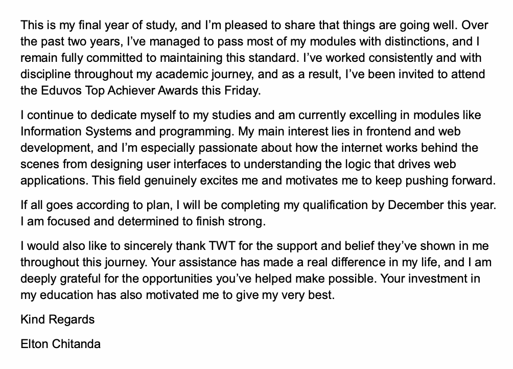 The Waterberg Trust has a policy of supporting outstanding students from the Waterberg who lack parental support. Elton Chitanda, who was awarded a TWT bursary to study computer science at Eduvos University in Guateng, South Africa, has won a Top Achiever Award, marking him a student of distinction in South Africa.