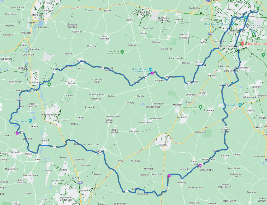 After a very sociable, sunny and scrumptious buffet lunch, about two thirds of the riders set off in small teams on the route home. It certainly did feel a little harder, the slight breeze now against us. The track from Cockayne Hatley to Hatley St George being particularly testing. The words of William Earnest Henley (buried there) seemed most appropriate “It matters not how strait the gate, How charged with punishments the scroll…”.